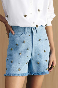 Edgy yet versatile, these washed denim shorts feature bold stud embellishments, and a frayed hem for a laid-back, stylish vibe.
