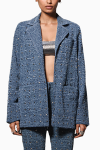Featuring Blue Washed Distressed Denim Studded Blazer by Mellow Drama from their A/W'24 Collection - Catalyst. Elevate your denim style with this oversized blazer crafted from 100% Cotton denim. The self-engineered distressed washed denim and all-over stud detail add an edgy touch, while the front pockets and open blazer design create a modern silhouette. Make a statement with this bold and chic piece.