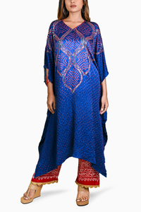 Step into elegance with our Bandhani Kaftan, featuring a beautifully embellished yoke adorned with intricate sequins. This graceful ensemble is perfectly paired with contrasting red pants, creating a striking and timeless look that effortlessly blends tradition with contemporary style.