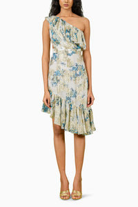 This Blue & White Floral One-Shoulder Draped Dress features a gold foil base with a waist cut-out and soft ruffle detailing. Its fluid, contemporary silhouette exudes refined charm, making it perfect for elegant brunch outings or stylish daytime occasions.