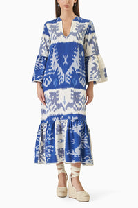 Featuring the Blue-White Monkey Viento Dress. Made from luxurious cotton in blue and white, this loose-fit dress is a blend of style and comfort, perfect for any occasion.