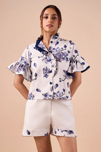 Add a touch of playful elegance to your everyday look with this ruffle cotton shirt and tailored shorts, both featuring a custom-designed orchid print. The soft fabric, flutter sleeves, and delicate floral detailing create a breezy, feminine charm. Perfect for warm days, this coordinated set blends comfort with effortless sophistication.