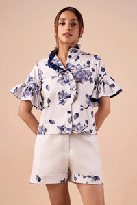 Add a touch of playful elegance with this ruffle cotton shirt, featuring a custom-designed orchid print. The soft fabric and flutter sleeves offer breezy comfort, while the delicate floral pattern brings a refined, feminine charm to everyday dressing.