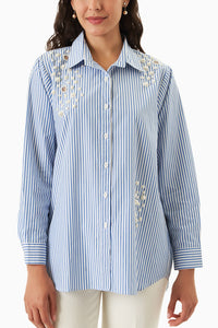 Featuring the Pearl Pop Shirt by Trisara, this blue and white striped cotton shirt adds elegance with delicate pearl embroidery detailing. Designed in a straight fit, it effortlessly combines timeless style with a refined, modern twist.