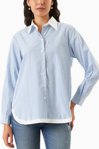 Featuring the Pin Bold Shirt by Trisara, this blue and white striped cotton shirt stands out with bold white colorblock detailing on the placket. Its straight-fit silhouette offers a clean, modern look with a striking design twist.