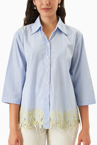 Featuring the Stripe Garden Shirt by Trisara, this blue and white striped cotton shirt is elevated with delicate cutwork thread embroidery. Designed in a straight silhouette, it merges classic patterns with intricate detailing for a refined everyday look.