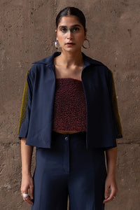 Featuring Blue Winged Crystal Comfort Jacket by Somya Goyal's Comfort Zone Collection, this short jacket highlights hand-textured recycled PVC cord detailing on the sleeves, with elbow-length coverage and a relaxed fit, offering a blend of style and comfort for everyday wear.