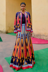 Featuring the Blue Yellow Kilim Lehenga Set from Swati Vijaivargie’s Mauj Collection – inspired by the vibrant Kilim Dhurry weaves of Rajasthan. This three-piece set includes a one-shoulder modal satin top, a kali-style linen satin lehenga with cancan, and a full-sleeve front-open jacket. Perfect for adding a pop of color and handcrafted charm to your festive wardrobe