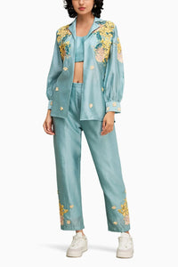 The Blue Zinnia Bustier features intricate embroidery and embellishments, creating a chic and contemporary look. It is paired with matching pants for a streamlined silhouette and complemented by an applique jacket in chanderi, adding a layer of elegance and sophistication to this striking ensemble.