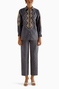 Step into casual elegance with this cotton denim coord set, adorned with intricate crochet and thread embroidery. Perfect for effortless style that stands out.