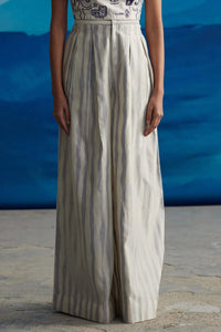 Introducing the 4 pleated pant: a contemporary take on the classic boyfriend-style trouser. These pants feature front pleats that add a touch of sophistication, complemented by practical side pockets for functionality. The generously wide leg not only enhances comfort but also exudes effortless elegance, making them an ideal choice for both casual outings and more formal settings. Crafted from luxurious chanderi fabric, these pants are not just stylish but also offer a lightweight feel that drapes beautifully.