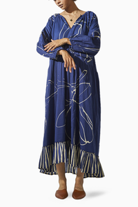 Featuring a printed anti fit dress with gather detailing, loose elasticated sleeves and stripeed hemline gathers.