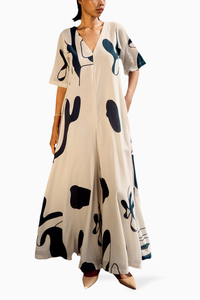 Featuring an off white lino print mul jumpsuit with a front zipper opening, V front neckline and half sleeves.