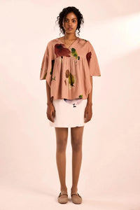 A breezy, blush-toned top with artsy water- colour inspired floral prints. Designed with a relaxed silhouette, pleated yoke, and wide sleeves for effortless movement and ease.