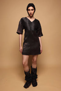Featuring the Blush Dress, a sculptural mini in deep black. It showcases half sleeves and a sharp V-neckline, crafted from handmade textiles that add artisanal texture and a refined fin