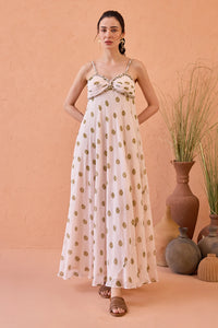 A breezy, full-length maxi dress designed especially for the Spring Summer. Crafted in lightweight chiffon, this piece features hand-block printed golden floral prints and polka dots on a soft blush base. The bodice includes a twisted knot detail at the bust, complemented by braided straps and a gathered bust overlay for added texture. The empire waistline flows into a flared hem, offering ease and movement. Ideal for resort wear or casual summer outings, this dress blends comfort with artisanal elegance.