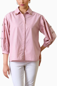 Embrace timeless sophistication with the *Blush Elegance Embellished Shirt*, designed for the modern woman who loves a touch of glam. Crafted in a soft pastel pink hue, this chic shirt features a structured collar with delicate gold embellishments, adding a refined accent to its classic design. The voluminous three-quarter sleeves, adorned with intricate bead and crystal embellishments, create a graceful and feminine silhouette. A concealed button placket enhances its sleek and polished look, making it a versatile piece that transitions effortlessly from day to night. Pair it with tailored trousers for an elegant work look or style it with jeans for effortless weekend charm.