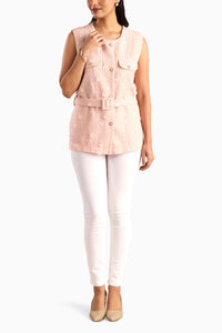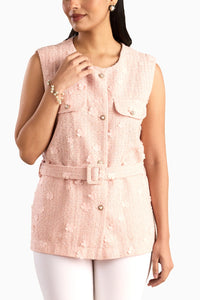 A blush-pink dress adorned with delicate fabric flowers for a feminine, romantic look. Featuring two chest pockets, pearl-like buttons, and a matching belt for a flattering shape, it exudes chic, elegant charm reminiscent of refined European style.