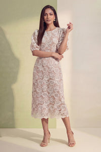 Featuring a sophisticated midi dress crafted in intricate floral lace, this elegant piece comes in a soft blush-beige base with delicate cutwork detailing for a refined finish. Designed with an elegant round neckline, it is elevated by statement puff sleeves with gentle gathers that add soft volume. The tailored straight silhouette offers a flattering, structured fit, while a scalloped hemline enhances its feminine charm. Fully lined for comfort and seamless wear, the breathable, lightweight fabric makes it ideal for day-to-evening occasions.