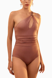Featuring Blush Loxos Swimsuit from Tizzi's Sepia Garden Collection. A luxurious multi-trimmed swimsuit with draped waist-band and one-shoulder drape. Adorned with a classic gold dumbbell and transcending chains, featuring a functional gold ring at the back. Removable cups for versatility.