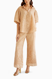 Introducing our Blush Pink Bandhani Tulip Top with Palazzo set. Made from exquisite Raidaana Crushed Silk Bandhani in a soft Blush Pink shade, it offers a comfortable fit and timeless style.