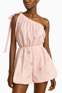 A soft and charming one-shoulder romper crafted in blush pink cotton poplin. Designed with a gathered neckline and a comfortable elastic at the center back torso, the silhouette cinches gently at the waist before flowing into flared A-line shorts. The shorts feature pleats originating from four dart lines, offering ease and graceful volume. The piece is adorned with delicate, hand-crocheted floral appliqués in pastel shades across the lower half. Finished with a center-back zipper closure for a clean fit.