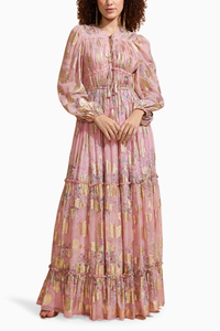 Featuring Blush Radiance Lurex Long Dress by Roseroom, made in soft pink and gold hues. Crafted from Georgette with printed embroidery and lace embellishments, it features rooching on the bust for added allure, offering a standard fit for timeless elegance.