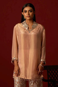 Grace your festive wardrobe with this blush tissue high-neck tunic, featuring elegant side panels and exquisite hand-embroidered mirror work in zari. Enhanced with delicate tassel accents and fine inner finishes, this refined silhouette blends subtle shimmer with timeless sophistication, perfect for both celebratory and contemporary occasions.