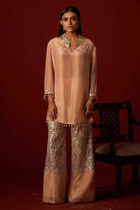 Step out in grace with this blush tissue hi-neck tunic set, featuring hand-embroidered zari mirror work and delicate tassel accents. Paired with matching palazzos and a satin bandeau, this ensemble offers a seamless blend of elegance and comfort, perfect for festive occasions and modern celebrations.