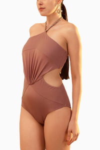 Featuring Blush Verve Swimsuit by Tizzi's Sepia Garden Collection. Tankini with a chic chain halter and N-hook closure at the back. Modest coverage with waistline cutouts for added allure. Includes removable cups for customizable support.