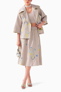 Elevate your style with the Bodrum Ecru Banana Crepe Embroidered Jacket & Skirt set, complete with a chic bralette. The oversized jacket showcases stunning machine embroidery, a statement collar, and 3/4th A-line sleeves, all highlighted by contrast piping. The fitted A-line skirt features side pockets and matching embroidery for a cohesive look. Paired with a fitted banana crepe bralette featuring adjustable straps and a side zipper, this ensemble effortlessly blends comfort and sophistication, making it perfect for any occasion.