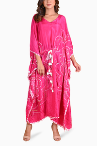 Enhance your style with our exquisite kaftan adorned with bandhani flower motifs delicately highlighted with sequins. The drawstring at the waist is adorned with handmade tassels and charming shell details, adding a touch of artistry to your ensemble.