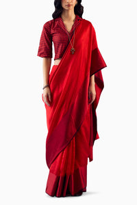 The Bold Allure Scarlet Saree is exquisitely crafted from handwoven silk mesh, offering a striking blend of sophistication and modern elegance. The vibrant scarlet color commands attention, while the satin borders on both sides add a touch of refined luxury.