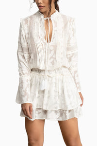 Bolivia Salts is made in exquisite floral pattern adorning romantic ruffle detailing and pintucks and lace inserts embellished with long tassel. Smocked at waist the mini dress has two tiers. Graceful & on-trend, this piece offers a classic and feminine appeal, this piece is your perfect spring partner.