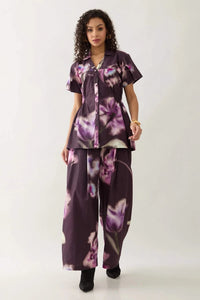 Featuring effortless sophistication, the Bombay Set in Haze Print pairs a short-sleeved shirt with slits, a front pocket, and classic black buttons with wide-leg pleated pants. Gathered waist detailing and a double-layered yoke add structure and style, making this coordinated set ideal for both relaxed and refined occasions.