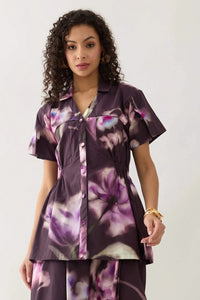 Featuring a breezy yet refined silhouette, the Bombay Shirt in Haze Print blends classic structure with modern ease. Short sleeves with side slits, a front pocket, and black buttons offer functionality and style, while gathered waist details and a double-layered yoke create a flattering, thoughtfully crafted design.