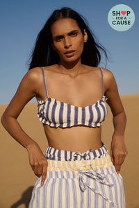Our Bordi Bralette is designed using striped cotton fabric. It features adjustable straps, an elasticated neckline, and a soft mulmul inner lining for a comfort fit. It pairs well with our Tijara Shirt and Ajanta Pants, and makes for a breezy summer pick.