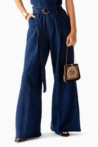 Featuring wide leg denim trousers in handwoven denim with bottom slits and frayed edges.