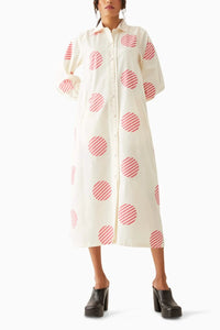 Boston dress with Spot print, a midi-length dress with A-line fit with contrast lanes print details on the cuff, back yoke and tie-up on sleeve cuffs. The ensemble achieves a balanced and modern look, perfect for both casual and semi-formal occasions.