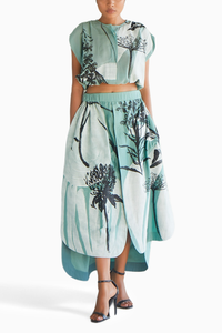 Featuring botanic print in black and white on sea base. Round placket opening neckline square crop top. Sleeves have subtle gather detail. The waist band is elasticised. Paired with botanic Print in White and Black on sea base. Elasticised waist band and front button down. The skirt has a high printed front and a low plain back with side pockets.