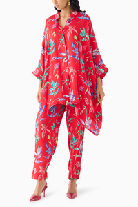 The Botanica Short Kimono & Trousers crafted from our stunning vegan silk fabrication, trans-seasonal, is a statement piece. This co-ord, digitally printed in our hand drawn Botanica floral print has a relaxed fit. With Kimono sleeves, the piece has front shell buttons and a collar. Featuring a formal look, it is paired with our Botanica trousers with a waistband and pockets. Wear it with heels for an elegant look.