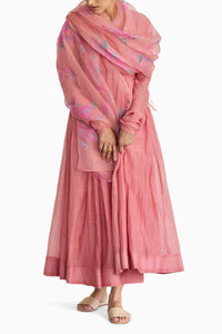 Introducing the Handwoven Chanderi Rose Color Anarkali, crafted with elegant gathers for a graceful, flowing silhouette. This beautiful anarkali is paired with an organza dupatta, adorned with delicate block print embellishments that enhance its charm. Complementing the ensemble are cotton trousers, ensuring both comfort and style. This set seamlessly blends traditional artistry with modern sophistication, perfect for any special event.