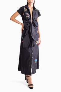 Featuring Bow Black Dress by Saaksha & Kinni from Botanica Collection. Collared shirt dress adorning intricate mirror and thread work with hand-embroidered scattered motifs. Enhanced by exaggerated bow detailing and a deep neckline, this dress combines classic elegance with striking, artisanal accents.