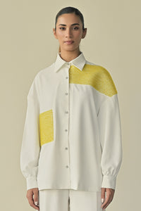 Featuring a collared shirt with distinctive box embroidery, this piece is designed with gathered sleeves finished with enclosed cuffs, offering a refined blend of texture and tailored elegance.
