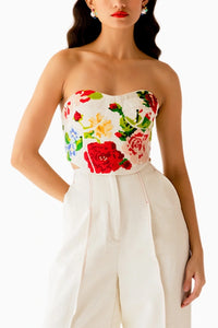 An absolute eye-turner , this floral structured beaded corset is made on 100% handwoven denim using age old beading technique re-interpreting cross stitch.