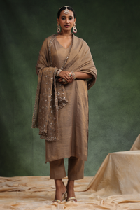The BISCUIT-inspired suit set is a masterpiece of intricate craftsmanship, where tradition meets opulence. The deep, rich fabric serves as the perfect canvas for the lavish fabric of tissue chanderi used in the entire set paired with a badla work dupatta also it is scalloped with the utmost patience and diligence.