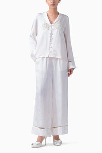 This Jacquard Pure Silk PJ Set offers the perfect blend of luxury and romance. Crafted from luxurious pure Mulberry Silk, this Pajama Set features a shirt adorned with a delicate hand embroidered pearls rose motif, while the matching Pajamas have a playful border around the hem. Ideal for brides or anyone seeking something special for memorable nights, this luxurious Pajama Set delivers timeless elegance with a modern twist. Whether it’s for lounging in luxury or celebrating a special moment, these silk pajamas are designed for those who appreciate romance, comfort, and style.