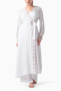 The Bridal Pearl Long Robe brings a touch of luxury to your loungewear. Made from soft modal, it features a stunning cascade of pearls down the back and shoulders, paired with flowing sleeves for an elegant, relaxed fit. Perfect for adding a hint of glamour to your "getting ready" moments.