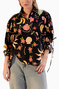 The Brie Shirt from NOIB's Spring/Summer 25 collection is a statement piece that combines bold design with intricate detailing. Crafted from luxurious cotton satin, it features the striking Seashell placement print on a sleek black base. Elevating its elegance, the shirt boasts hand embroidery on the collar, placket, and dori, complemented by intricate beading work on the collar for added finesse.