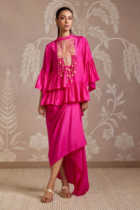 Bright Fuchsia Embroidered Frill Silk Top & Draped Skirt